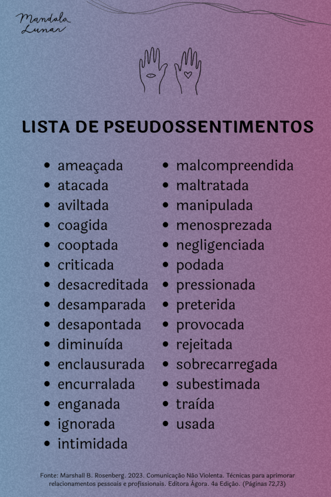 Na hora de nomear sentimentos, é comum expressarmos as nossas interpretações sobre os/as outros/as mais do que falarmos sobre o que está acontecendo dentro de nós. Por isso, no caminho da autoescuta, é importante aprendermos a diferenciar sentimentos de julgamentos — que podemos chamar de pseudossentimentos. Por exemplo, quando falamos “me sinto ameaçada, coagida, diminuída, ignorada, traída…” estamos falando mais sobre um pseudosssentimento do que de um verdadeiro sentimento, pois estamos avaliando a outra pessoa em relação a nós.