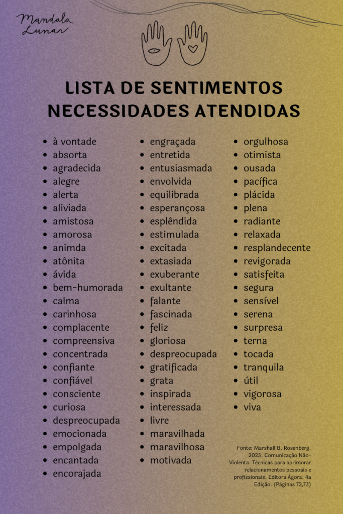 Você pode realizar as mesmas reformulações em relação a algum acontecimento ou vivência recente e tentar dar nome aos seus verdadeiros sentimentos. Para apoiar as suas reflexões e ampliarmos a nossa compreensão sobre esse universo, trouxemos aqui mais duas listas sobre sentimentos (baseados em necessidades atendidas ou não) que você pode utilizar nas suas práticas: