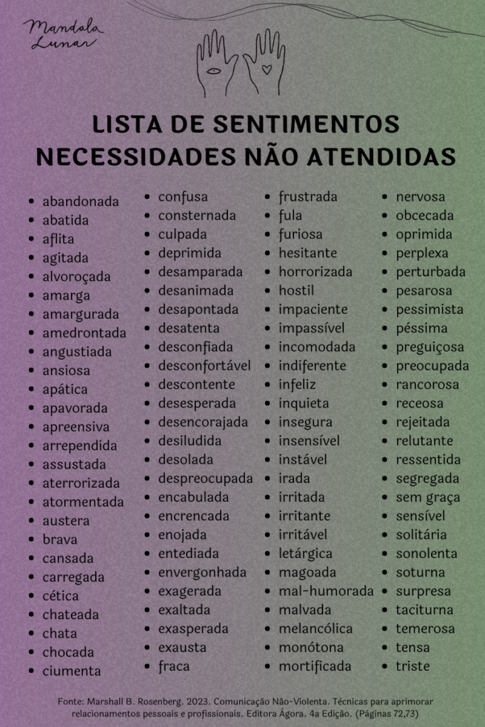Ao fazer esses exercícios, talvez você sinta dificuldade em se expressar de forma certeira ou em colocar os seus sentimentos em palavras. Isso acontece porque nomear nossos sentimentos requer exercitar uma musculatura frequentemente atrofiada, já que muitas vezes somos instigadas a ficar voltadas para as outras pessoas, em vez de conectadas com nós mesmas. Dessa maneira, segundo Rosenberg, costumamos ter mais vocabulário para rotular as outras pessoas do que para “descrever claramente nossos estados emocionais”.