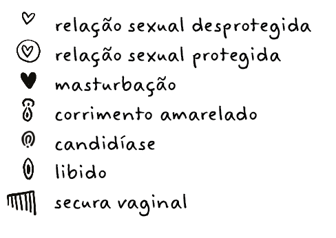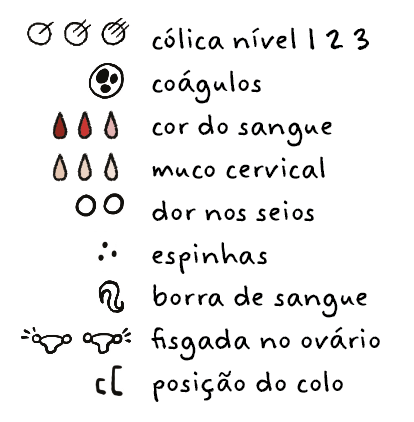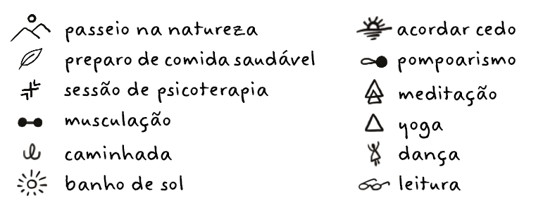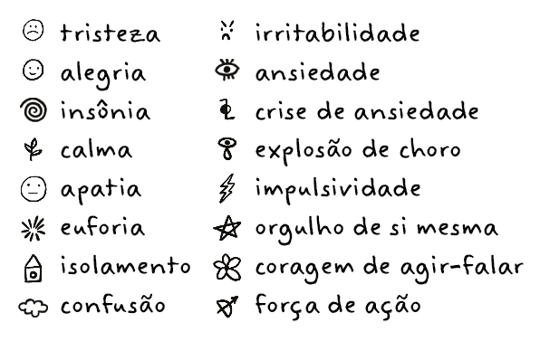Para marcar ações eventuais, hábitos ou rotinas (meditação, caminhada, estudo, dança), uso eventual de substância aditiva (café, açúcar, álcool ou tabaco), questões físicas (resfriado, dor de cabeça), emoções e sensações (felicidade, tristeza, fúria, ansiedade, criatividade), ações ou acontecimentos (conflito interpessoais, contato com natureza, relação sexual, sonhos importantes). Para quem menstrua, anotações sobre o ciclo menstrual (ovulação, cólicas, dor nos seios). Sua biblioteca de ícones vai sendo construída ao longo do ano.
