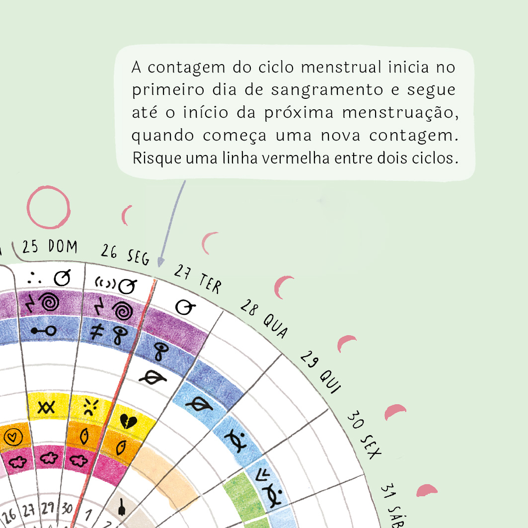 Registre a contagem do seu ciclo menstrual. Ele inicia no primeiro dia de sangramento (vermelho vivo) e segue até o início da próxima menstruação, quando começa uma nova contagem. O ciclo menstrual dura quase o mesmo tempo que uma lunação mas muito raramente os dois ciclos começam no mesmo dia. Por isso, seu ciclo ficará quase sempre dividido em dois diagramas. Risque uma linha vermelha entre dois ciclos para marcar cada novo cic