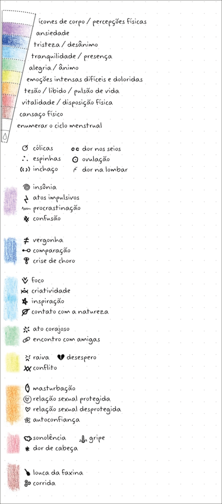 Para marcar ações eventuais, hábitos ou rotinas (meditação, caminhada, estudo, dança), uso eventual de substância aditiva (café, açúcar, álcool ou tabaco), questões físicas (resfriado, dor de cabeça), emoções e sensações (felicidade, tristeza, fúria, ansiedade, criatividade), ações ou acontecimentos (conflito interpessoais, contato com natureza, relação sexual, sonhos importantes). Para quem menstrua, anotações sobre o ciclo menstrual (ovulação, cólicas, dor nos seios). Sua biblioteca de ícones vai sendo construída ao longo do ano.